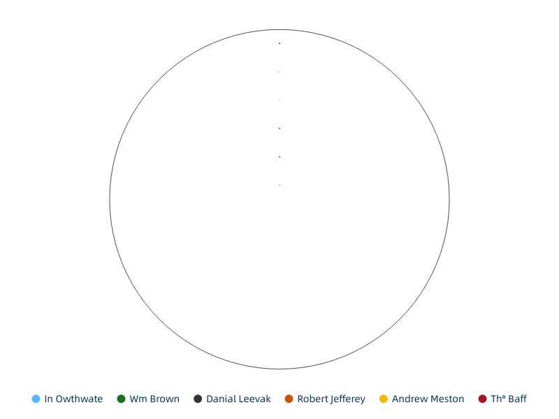 This spiral plot chart titled 'Everyday Rhythm: Tracking Attendance of May 1788' uses the total number of days worked by six inmates of the Workhouse- Owthwate, Brown, Danial, Robert, Andrew and Baff- to record their attendance, with small circles indicating their holiday or absence from work. The chart's radial axis represents each individual's attendance as a separate line, starting at the center of the chart with the first day of the year and spiraling outward for each subsequent day.