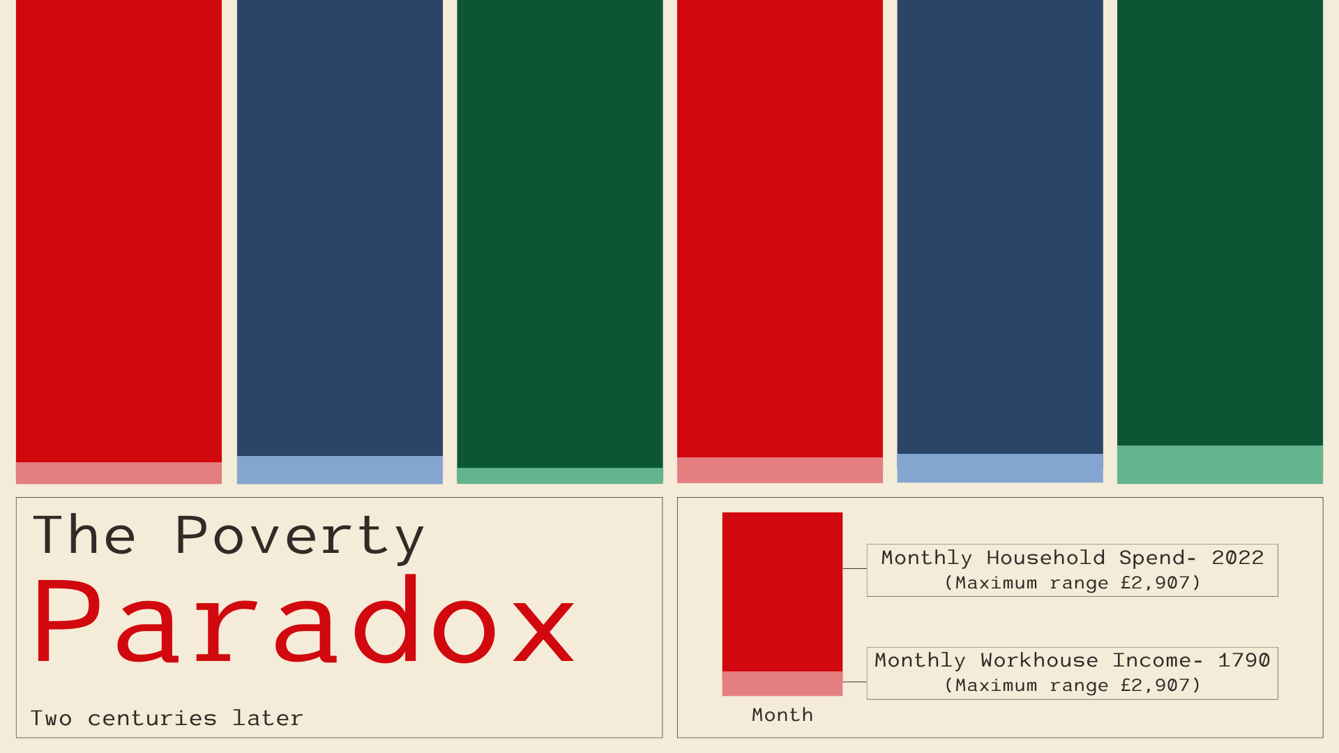 Seemingly simple transactions when analysed through data illustrate a better perspective of economic conditions. This becomes particularly evident when we examine a data visualisation comparing expenditure and income. The Poverty Paradox is a visualisation that underscores the persistent nature of poverty in the UK and the urgent need for continued efforts to address this critical issue. The striking poverty data visualisation emphasises two major data points: Average monthly household expenditure in the UK in 2022 and monthly workhouse income from July 1790- December 1790. By highlighting these crucial points, the visualisation reveals that even with inflation taken into account, monthly income struggles to cover essential expenses in current times. The data for the year 1790 has been collected from the Knaresborough Workhouse Daybook and the data for the year 2022 has been digitally scrapped from the Office for National Statistics UK.